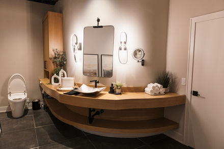 Garage Complex featuring custom locker room style cabinetry with glass accents and a stylish curved white oak vanity